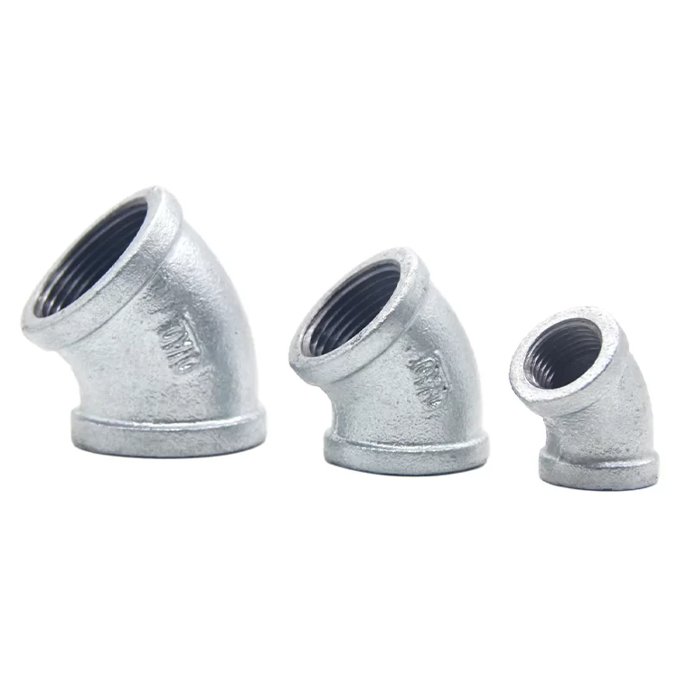 Galvanized Malleable Iron 45-Degree Elbow: Designed for smooth, angled pipe turns. Constructed from malleable iron and hot-dip galvanized for corrosion protection. Optimized flow channels reduce resistance and impact, suitable for compact layouts, providing a smooth turning solution for HVAC and plumbing systems.